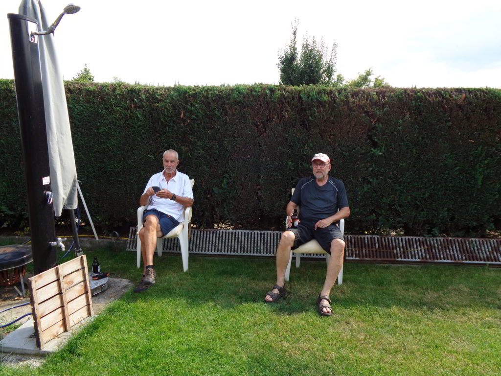 Dem Regen entronnen, im Garten angekommen…. Da sitzen sie nun die zwei Veteranen. Grillen ist angesagt, Tisch und Stühle vorbereitet. Den Grill in der Nähe, damit der Gastgeber ohne Umstände servieren kann. Die Sonne von der Terasse verbannt. Und dann.. Die beiden Eigenbrötler setzen sich meterweit entfernt in den angeblichen besseren Schatten. Essen, Trinken und bewegen sicht nicht von der Stelle. Das nennt man dann Freunde! Aber Hauptsache es geht ihnen gut!