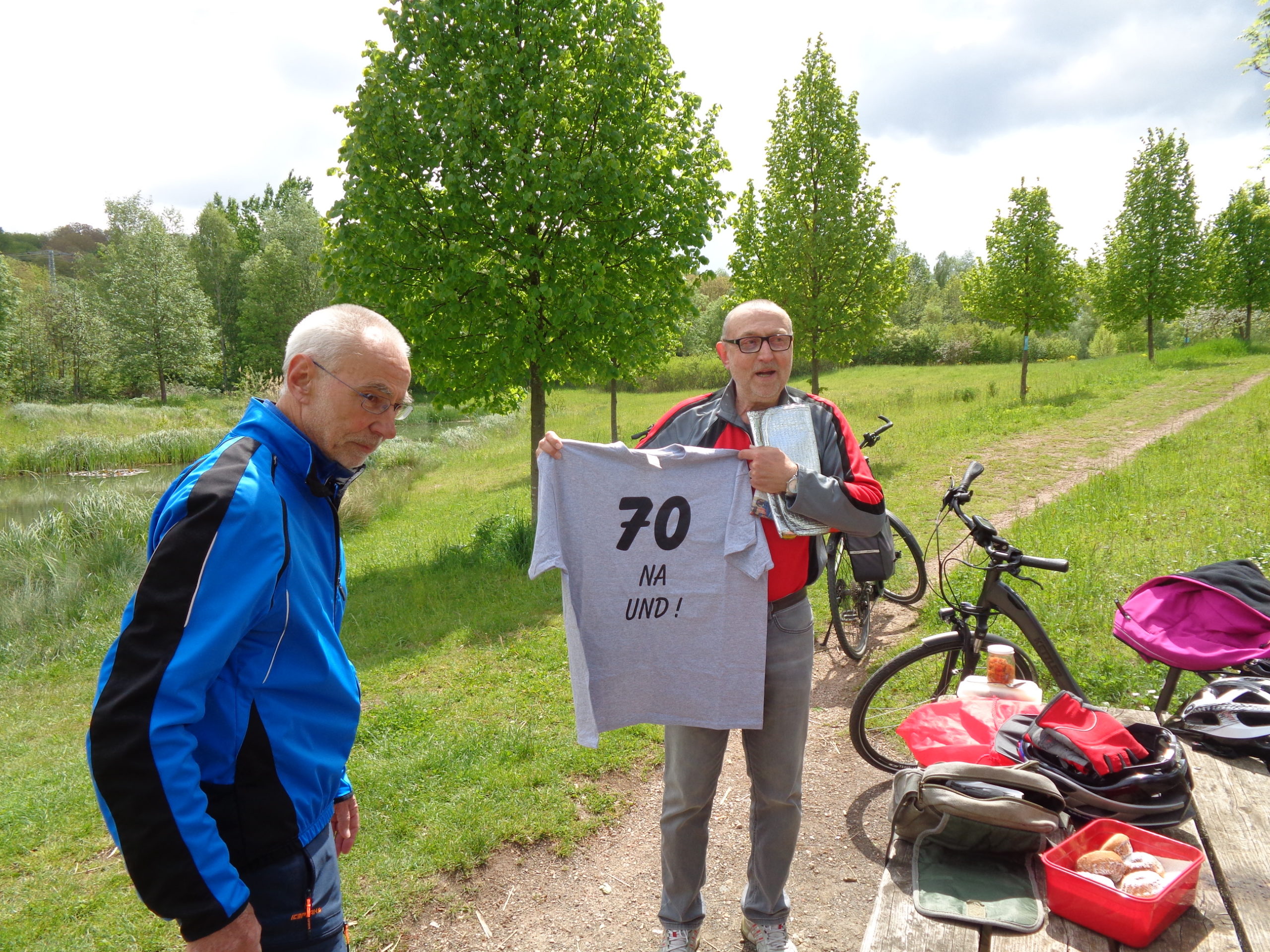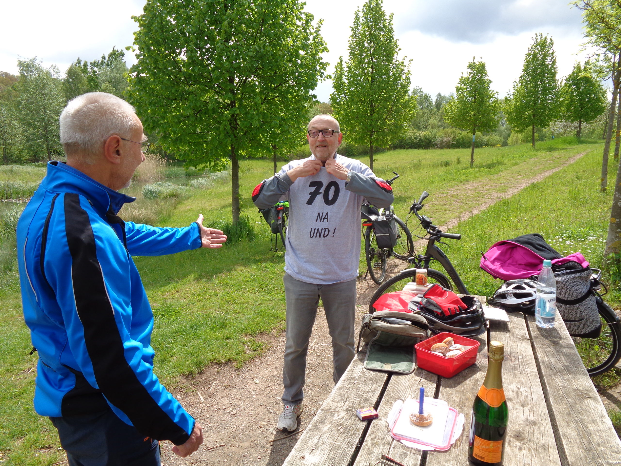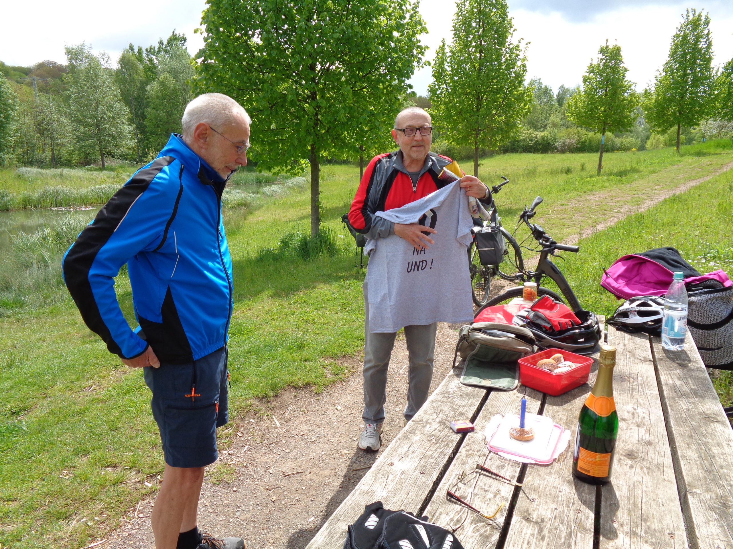 Wer sich ein Tag nach seinem 70. Geburtstag auf das Fahrrad schwingt, um mit seinen langjährigen Begleitern die erste Tour 2021 zu unternehmen, der verdient Anerkennung. Ein Kleidungsstück, das er in Zukunft auf jeder weiteren Fahrt zu tragen hat, wird somit zur Verpflichtung. Die Idee und Ausführung haben wir unserem Organisator Klaus zu verdanken, der tapfer und unter größten Anstrengungen diesen Ballast bis zu unserem 2. Halt transportiert hat. Unser Geburtstagsmann (Kind kann man ja nicht sagen) hat natürlich pflichtgemäß sein Bestes dazu beigetragen, dem Anlass geboten, e i n e gekühlte Flasche Sekt beizusteuern. Fahrradhelme ab! Meine Wenigkeit konnte in diesem Fall, sowie es der Zufall names Ulrike es will, die obligatorischen Minikuchen anbieten. Sekt mit Kuchen eine nicht zu verachtende Kombination. Wohl dem, der einen stabilen Magen hat! Aber alles kein Problem für gestählte Tourenradler*in (Genderausnahme)!