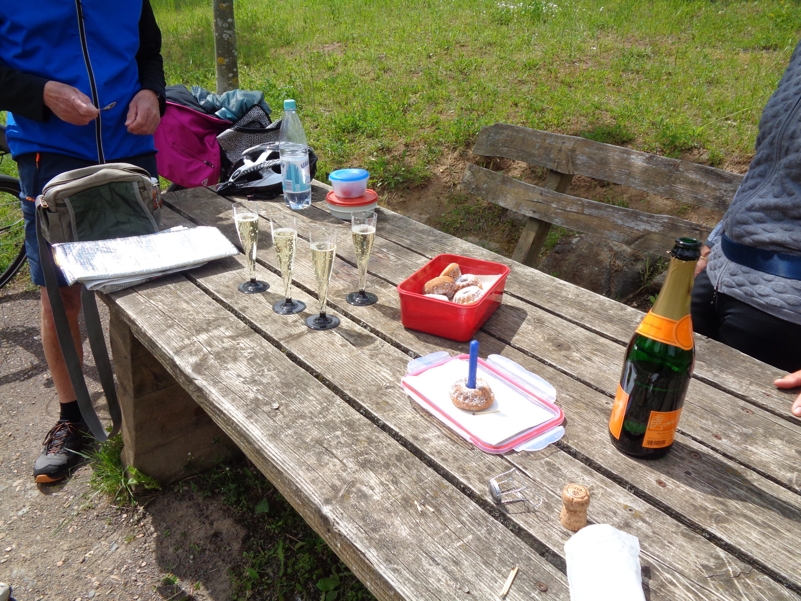 Dieser zweite Halt ist akribisch geplant! Und wie der Zufall es will, hat unser Geburtstagsveteran Stefan anlässlich seines 70sten Geburtstags keine Kosten und Mühen gescheut, für 4 Personen großzügig 1 Flasche Sekt zu spendieren. Unser Geburtstagsgeschenk, dankeswerter Weise von Klaus organisiert, scheint im XXXL Format ausgefallen zu sein. Aber das täuscht natürlich!
